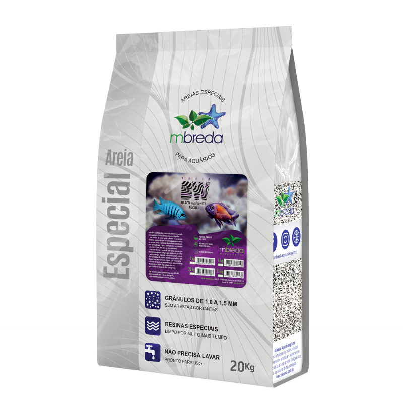 Areia Black and White Alcali é uma areia alcalina especialmente recomendada para aquários de Ciclídeos Africanos e aquários marinhos, composta por uma mistura de areias preta e branca para um acabamento estético aprimorado. Com grânulos de 1,0 a 1,5 mm, é ideal para um acabamento fino e ajuda a alcalinizar a água. Preparada com resinas especiais, dificulta o surgimento de algas e mantém o substrato limpo por mais tempo. A areia vem limpa e pronta para uso, garantindo água cristalina desde o primeiro dia, sem necessidade de lavagem. O pH da areia varia entre 8,0 e 9,5.